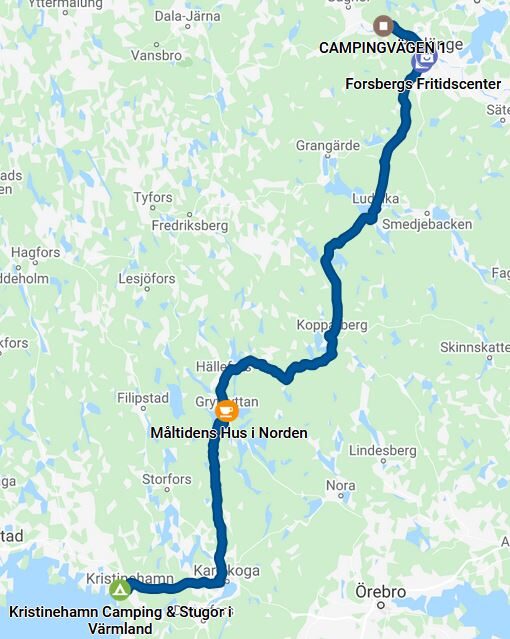 Dags att lämna Herrgårdslivet och dra vidare uppåt i landet. Lämnade Kristinehamn med tanken att ta lunch på Måltidens Hus i Grythyttan, som tyvärr hade stängt, det fick bli ett Café istället i Grythyttan. Åkte vidare till Borlänge för ett litet besök hos Forsbergs och senare Lager 157 och Dressman innan vi landade på en liten camping bredvid Dalälven i Sifferbo