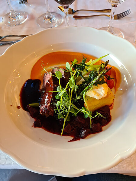 Lågtempererad ryggbiff serveras med sötpotatispuré, pak choy, portvinssås, potatiskaka med chévre, rödbetschutney samt sommarprimörer